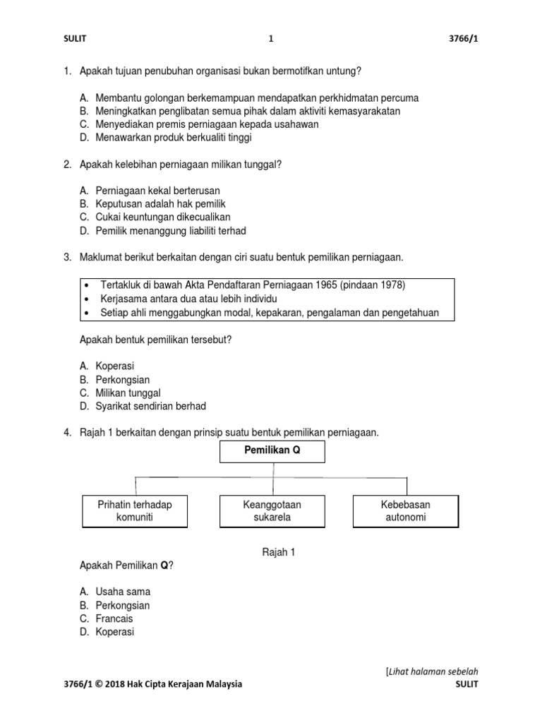 Pemilikan perniagaan melihat perspektif pemilik atau tuan punya perniagaan. A Usaha sama b Perkongsian c Francais d Koperasi 6 Perniagaan ini mudah diuruskan dan ditubuhkan dikenakan cukai individu dan keputusan dibuat sepenuhnya oleh pemilik. Apakah pemilikan perniagaan ini.